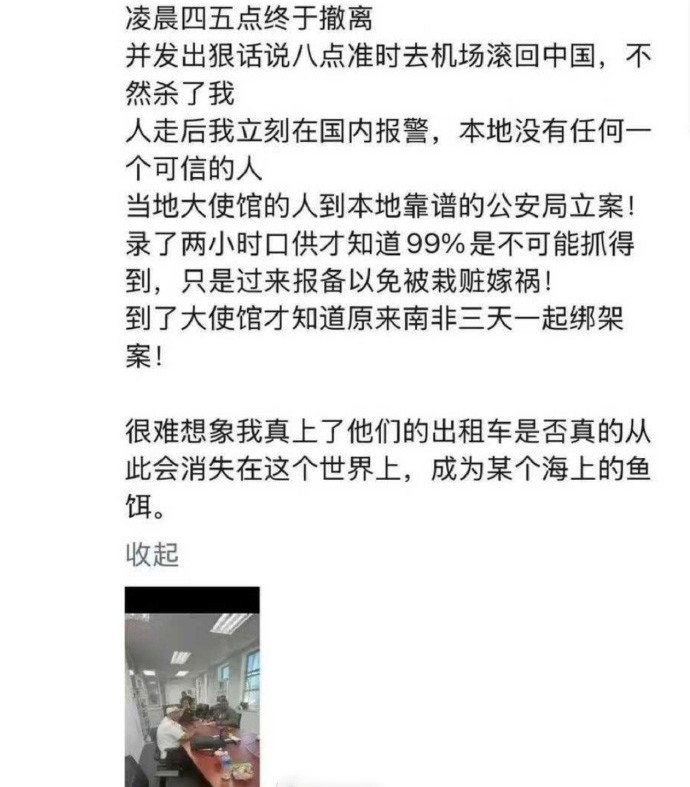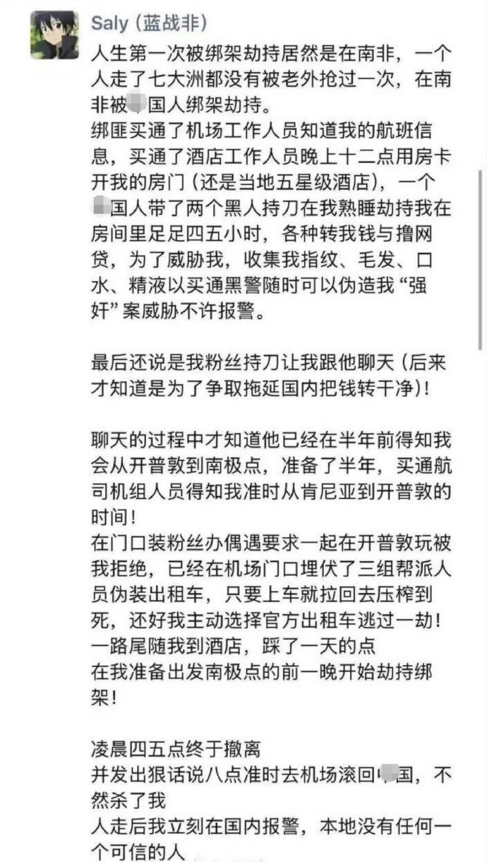 “我在南非深夜被劫匪买通酒店内部工作人员开门,被一个中国人带着两个黑人持刀威胁四五个小时。”蓝战非在粉丝群中这样描述。