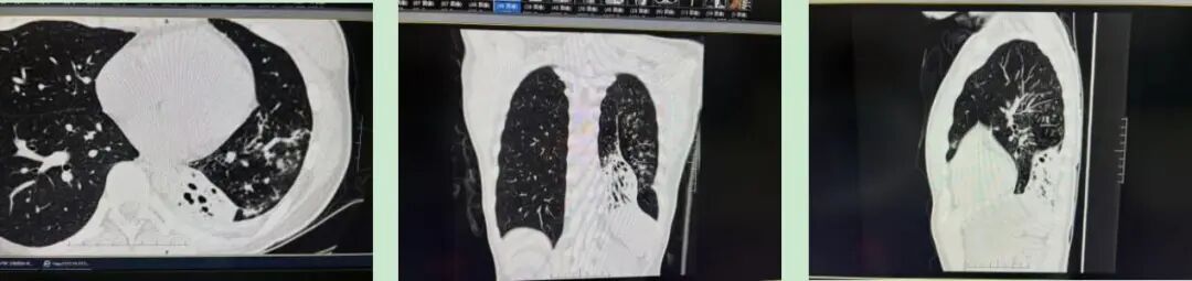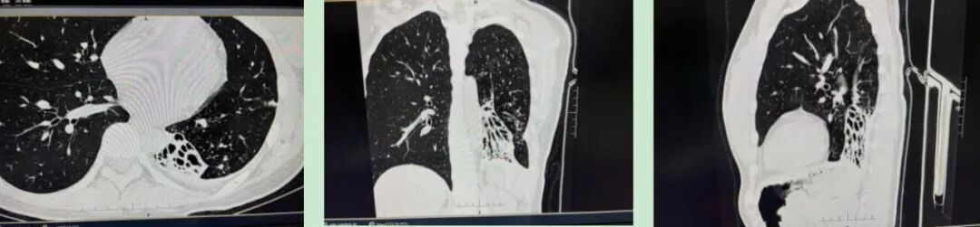 7 个月前,20多岁的小林突发咳嗽、咳痰,在其他医院治疗后病情未得到控制,还出现痰中带血、呼吸困难的症状,遂至中信惠州医院呼吸医学中心就诊。胸部 HRCT 检查显示:1.双肺多叶段多形态感染性病变,请结合临床实验室检查除外继发性肺结核,真菌感染等。2.左肺下叶实变、体积缩小,肺不张。3.左肺门及纵隔淋巴结钙化。纵隔向左侧偏移。4.左侧胸膜肥厚并钙化。