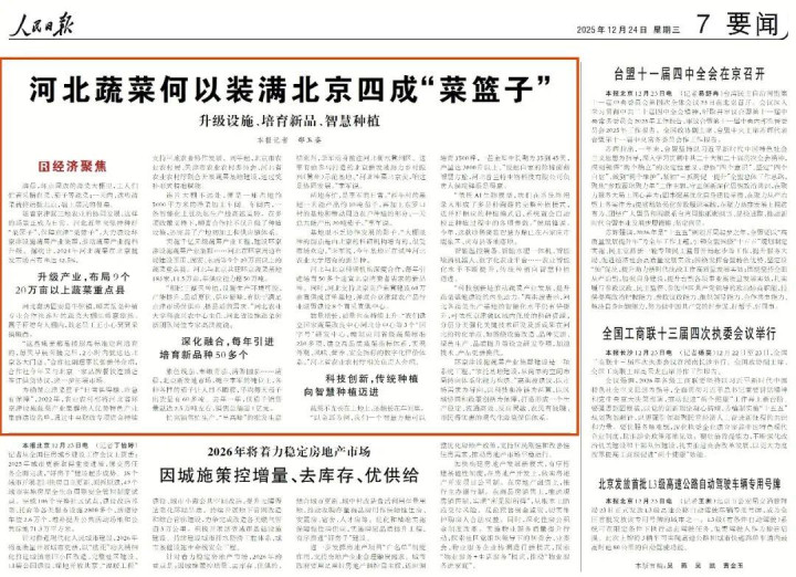 随着京津冀三地农业的协同发展,这样的场景正成为日常。河北近年来坚持种好“菜园子”、保障京津“菜篮子”,大力建设环京津设施蔬菜产业集群,推动蔬菜产业提档升级。据统计,2024年河北蔬菜在北京批发市场占有率达42.5%。