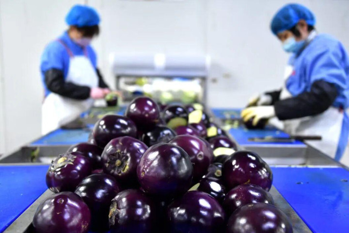在河北省深州市一家净菜加工企业,工作人员在生产车间内加工茄子。
