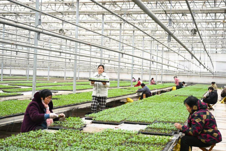 河北廊坊固安县牛驼镇,顺斋瓜菜种植专业合作社连片的蔬菜大棚里绿意盎然。蒿子秆培育大棚内,数名员工正小心翼翼采摘嫩苗。